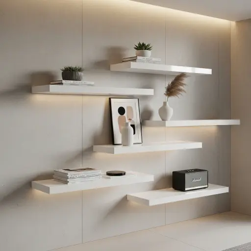 Las prateleiras flotantes son ideales para crear un ambiente limpio y moderno. Su diseño sin soportes visibles aporta ligereza visual y hace que la sala se vea más amplia. Además, son muy versátiles y fáciles de instalar.