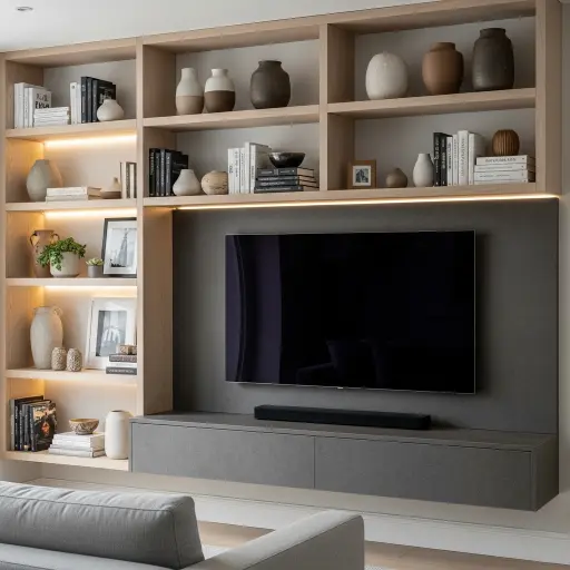 Las prateleiras empotradas optimizan el espacio y ofrecen un diseño limpio. Se integran en la arquitectura del hogar, creando un acabado elegante. Son perfectas para salas modernas.
