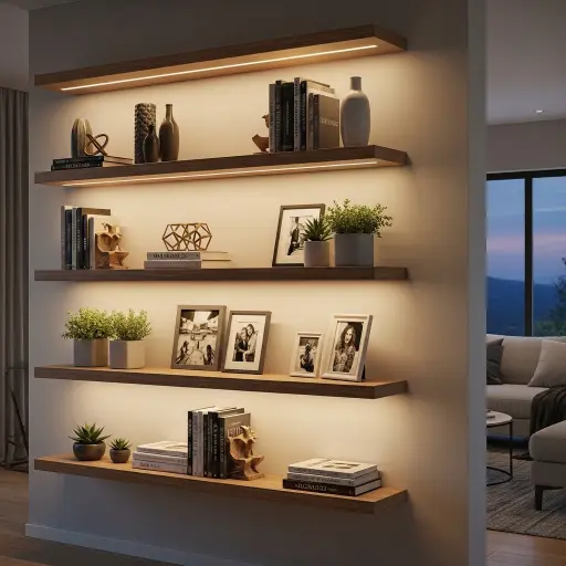 La iluminación LED en prateleiras añade un toque moderno y elegante. Resalta los objetos decorativos y mejora la estética del espacio. También crea un ambiente acogedor.