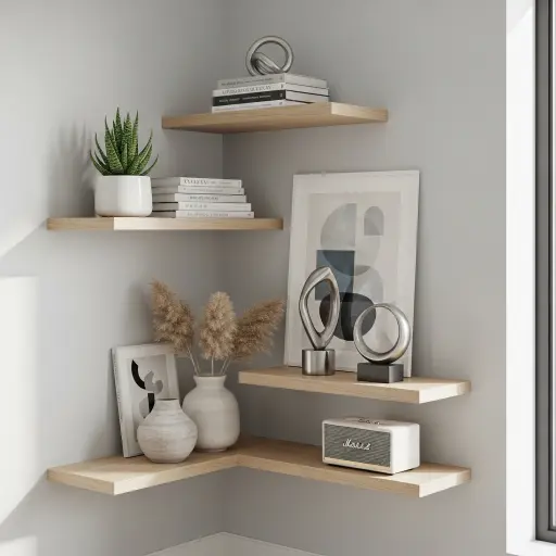 Las prateleiras de esquina aprovechan espacios desaprovechados. Son ideales para salas pequeñas donde cada centímetro cuenta. Además, ayudan a mantener el orden sin ocupar mucho espacio.