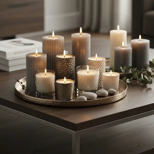 Las velas aportan calidez y un ambiente acogedor a la sala. Se pueden combinar diferentes tamaños y estilos para crear un diseño atractivo. Son ideales para una decoración moderna y sofisticada.
