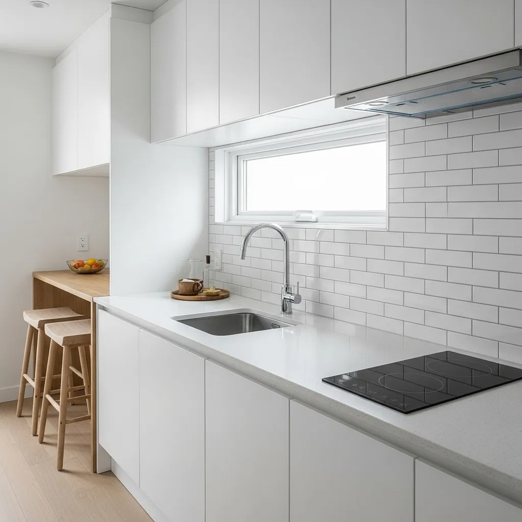 A cozinha linear funciona muito bem em espaços pequenos. Tudo fica em uma parede só, organizado e sem firula. Eu adoro porque facilita a circulação e deixa o ambiente mais leve.