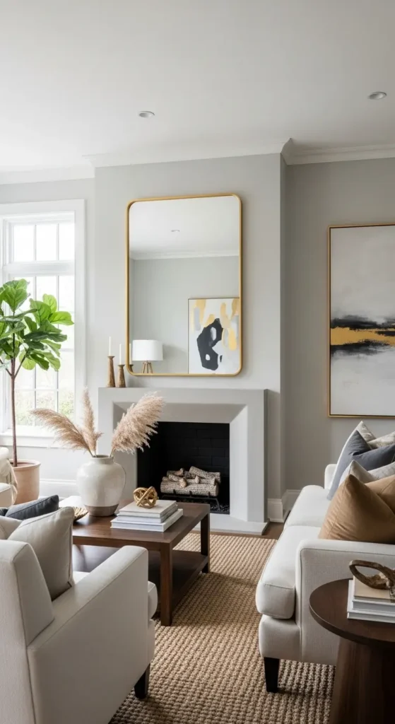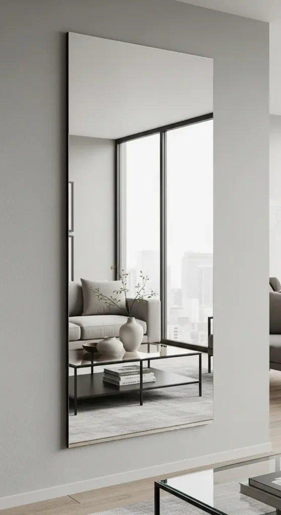 Los espejos grandes aportan una sensación de amplitud inmediata. Reflejan la luz natural y hacen que la sala se vea más espaciosa. Además, funcionan como elemento decorativo principal.