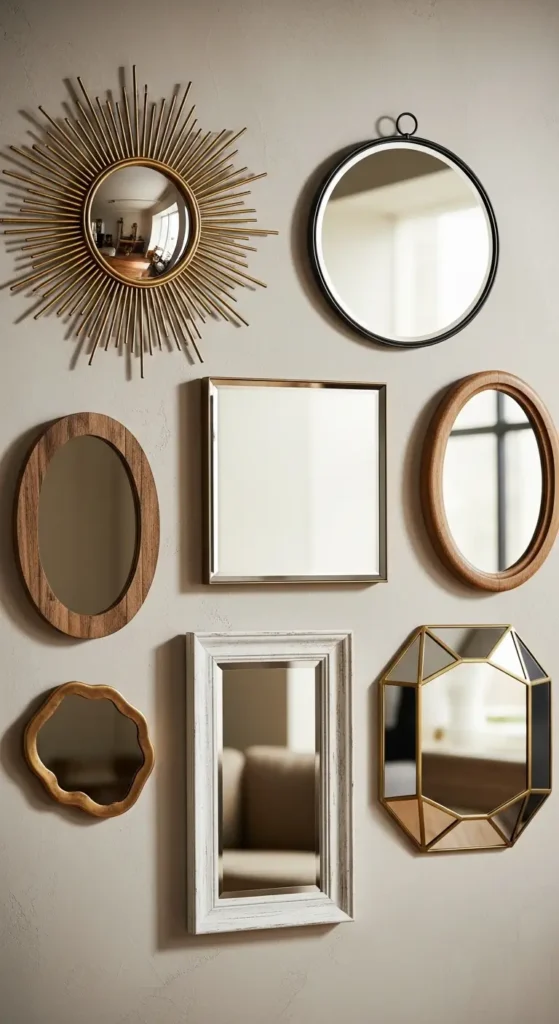Agrupar varios espejos crea un diseño dinámico y moderno. Esta opción permite jugar con formas y tamaños para personalizar el espacio. Además, aporta creatividad a la decoración.