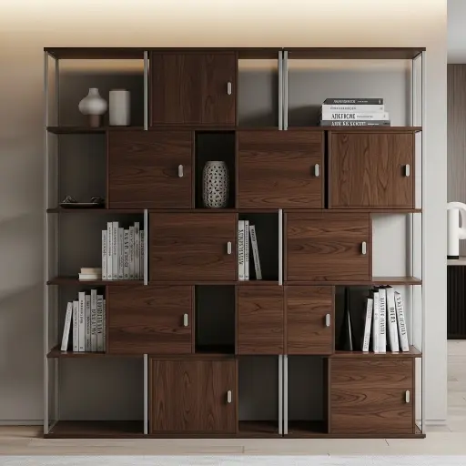 Este tipo de estante combina almacenamiento y decoración en un solo mueble. Incluye espacios adicionales para guardar objetos. Es ideal para mantener la sala organizada.