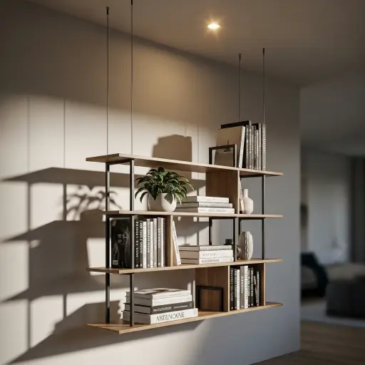 Los estantes flotantes minimalistas destacan por su diseño limpio y moderno, ideal para salas contemporáneas. Al no tener soportes visibles, crean una sensación de amplitud y orden visual. Son perfectos para espacios pequeños donde se busca ligereza estética.