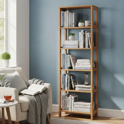 Los estantes verticales son perfectos para aprovechar la altura del espacio. Son ideales para salas pequeñas. Además, mantienen un diseño limpio y moderno.