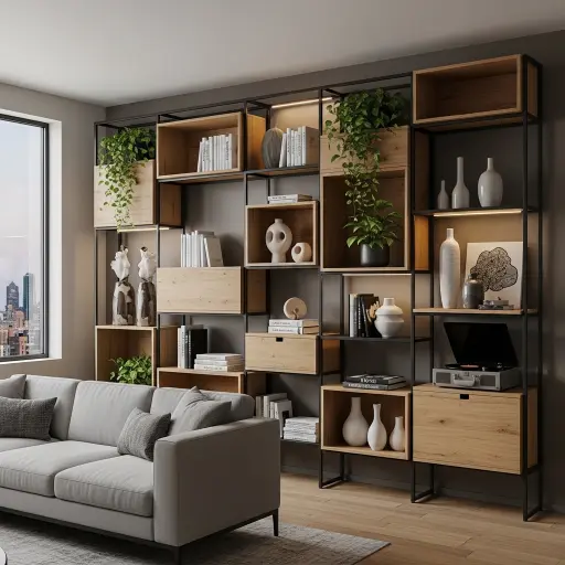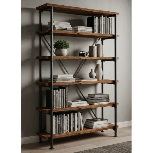 Este tipo de estante combina metal y madera para crear un estilo industrial moderno. Aporta carácter y contraste visual al espacio. Es ideal para salas contemporáneas con personalidad fuerte.