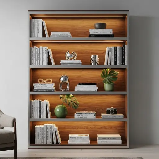 La iluminación LED en estantes resalta los libros y objetos decorativos. Además, crea un ambiente elegante y moderno. Este diseño es tendencia en interiores contemporáneos.