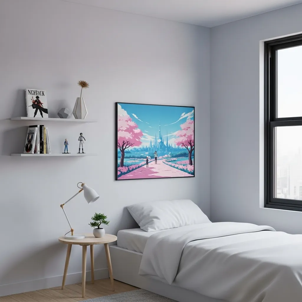 Pôster de anime funciona. Sempre funcionou. Mas quarto pequeno não perdoa exageros.