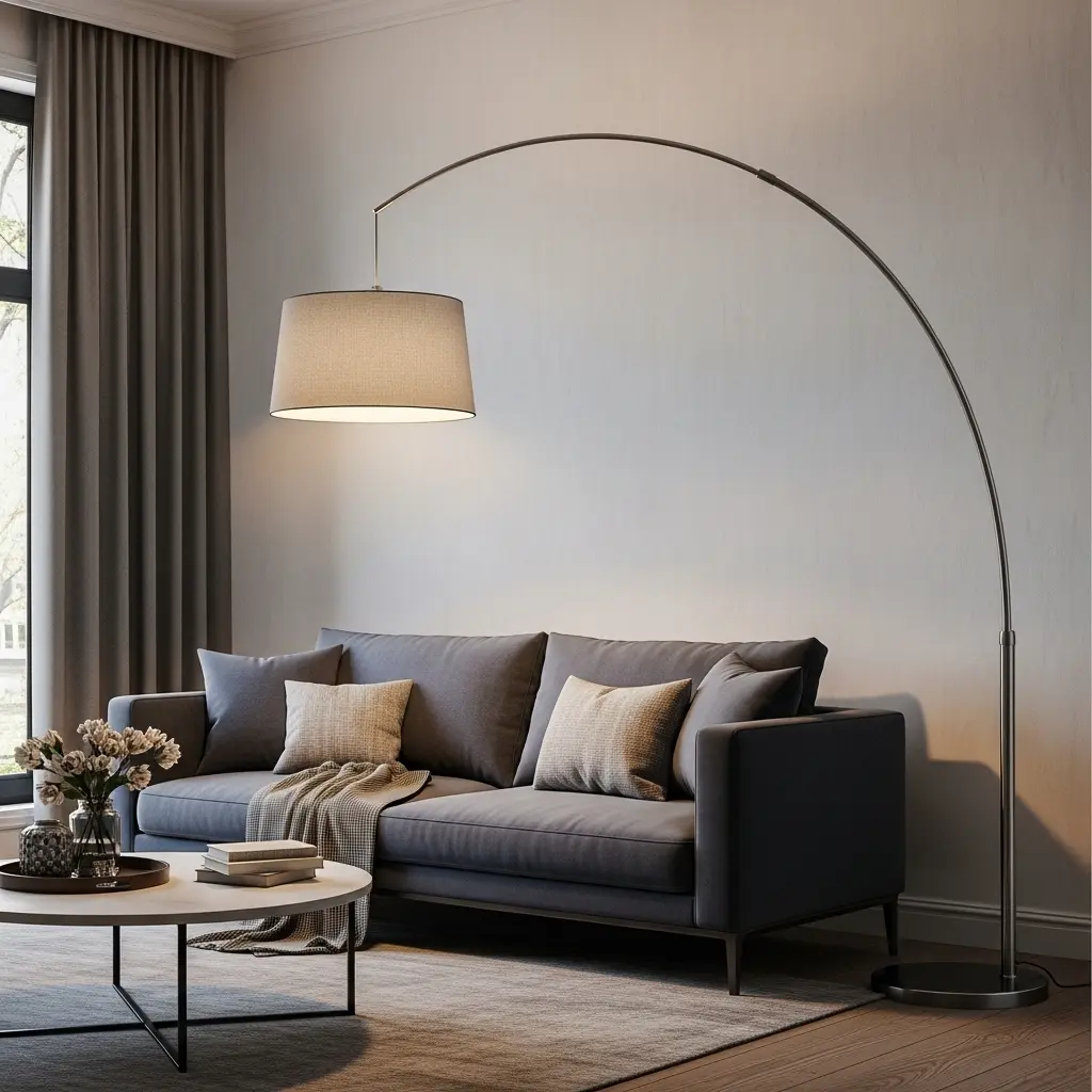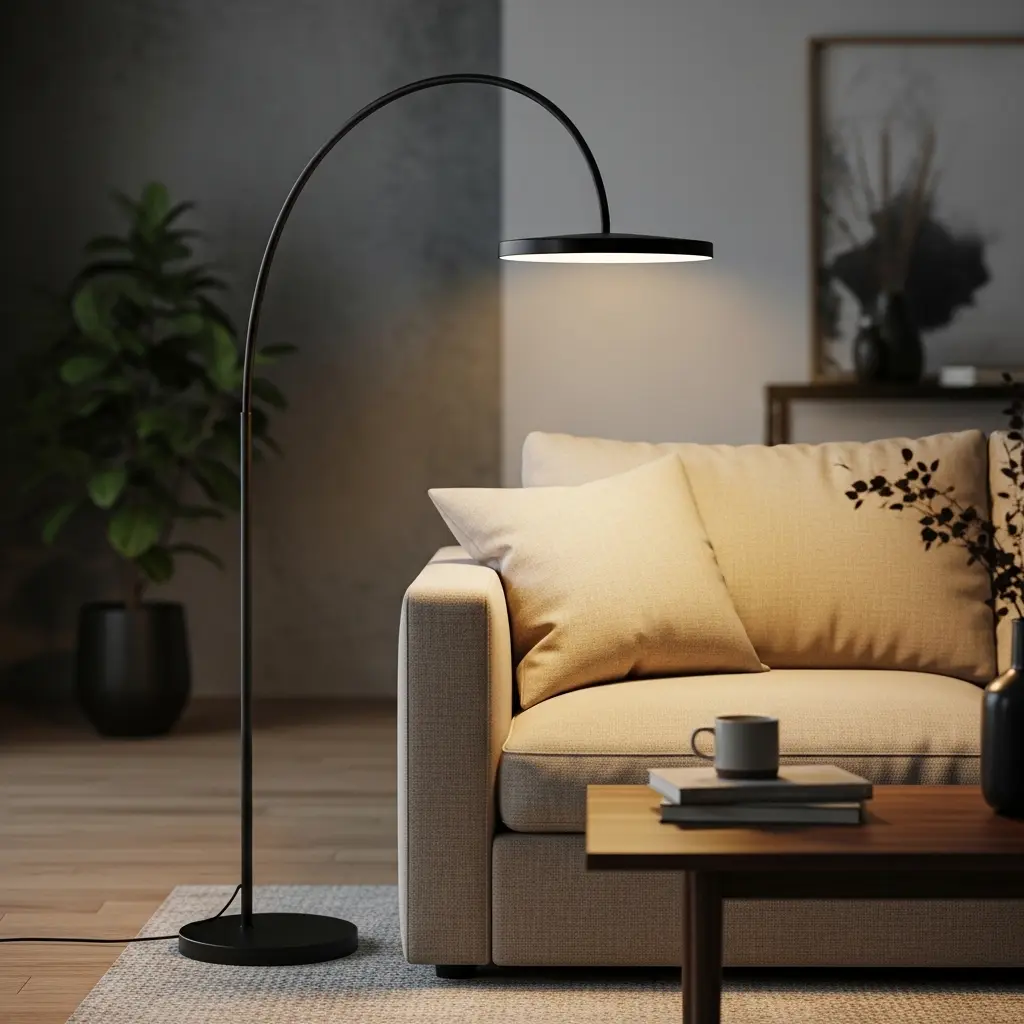 La lámpara de arco es una de las más populares en diseño moderno. Su estructura curva permite iluminar áreas específicas como mesas o sofás. Además, añade un toque sofisticado.