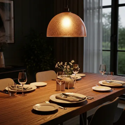 Los lustres con esferas de vidrio aportan sofisticación y ligereza visual. Permiten una difusión suave de la luz y crean un ambiente acogedor. Son una tendencia muy popular en comedores modernos.