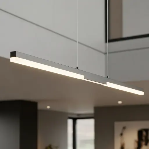 Este tipo de lustre es perfecto para mesas largas. Proporciona una iluminación uniforme y equilibrada. Además, aporta un diseño moderno y funcional.
