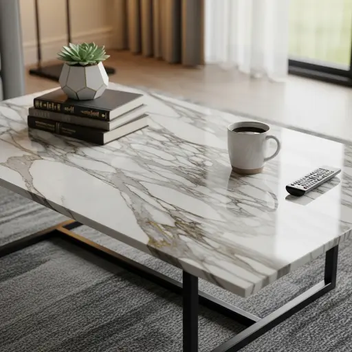 El mármol es sinónimo de lujo y sofisticación. Las mesitas con este material elevan la estética de la sala. Son ideales para ambientes modernos elegantes.