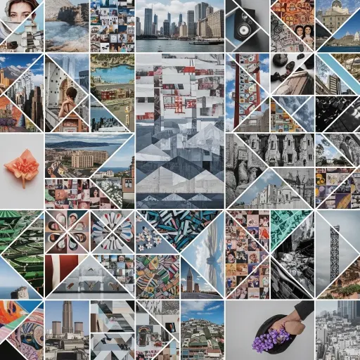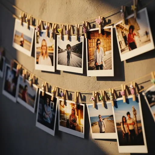 Organizar las fotos en formas como cuadrados o círculos crea un diseño único. Este estilo aporta originalidad y modernidad. Es ideal para espacios creativos.
