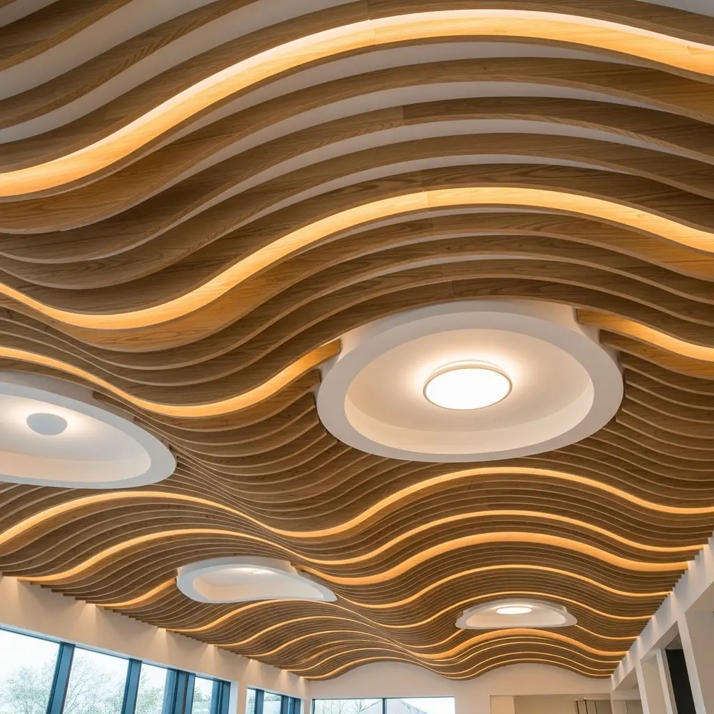 La madera añade calidez y naturalidad al diseño. Este tipo de plafón combina lo moderno con lo acogedor. Además, es ideal para estilos escandinavos.