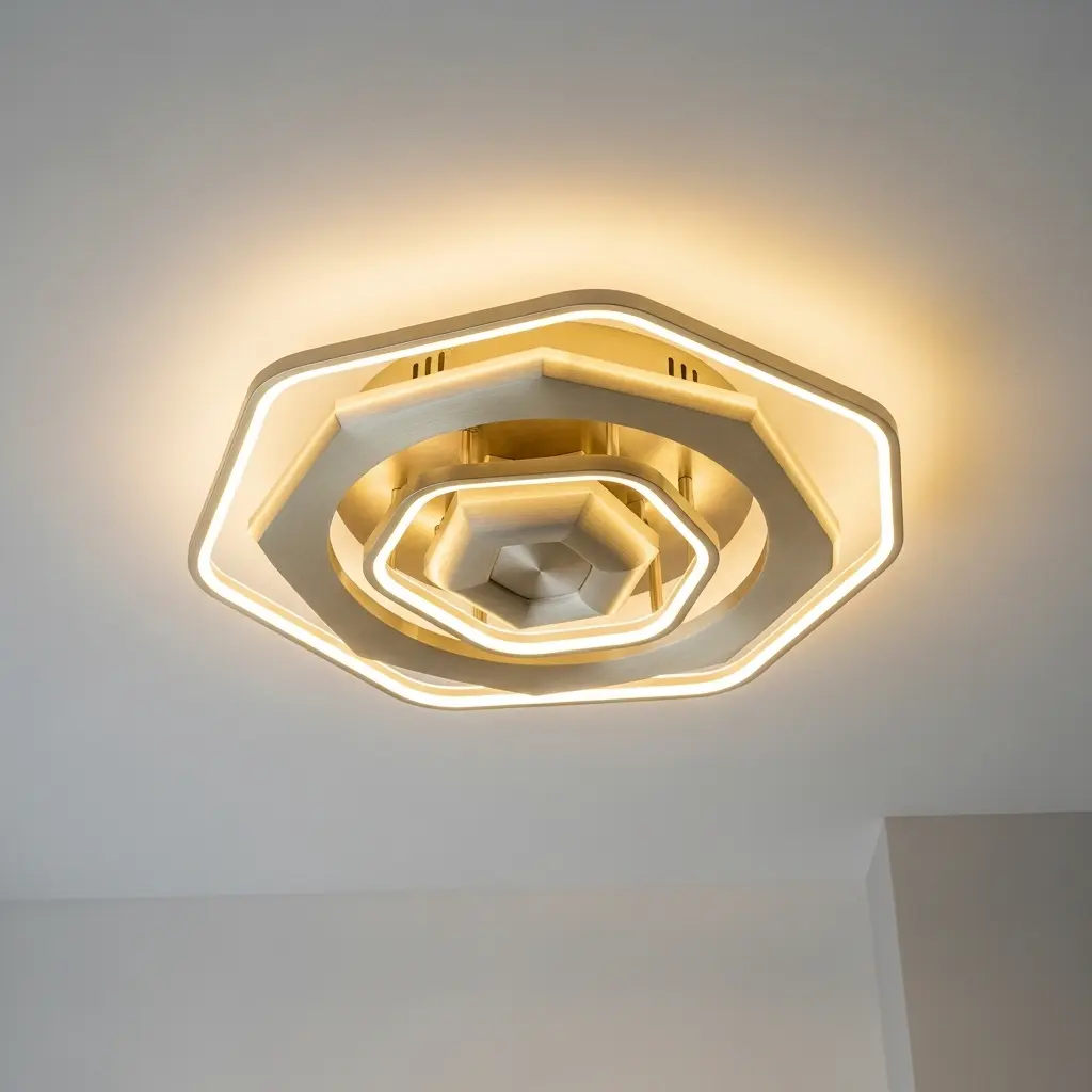 Los acabados metálicos como dorado o plateado aportan lujo y sofisticación. Este tipo de plafón refleja la luz y mejora la iluminación. Además, añade un toque elegante.