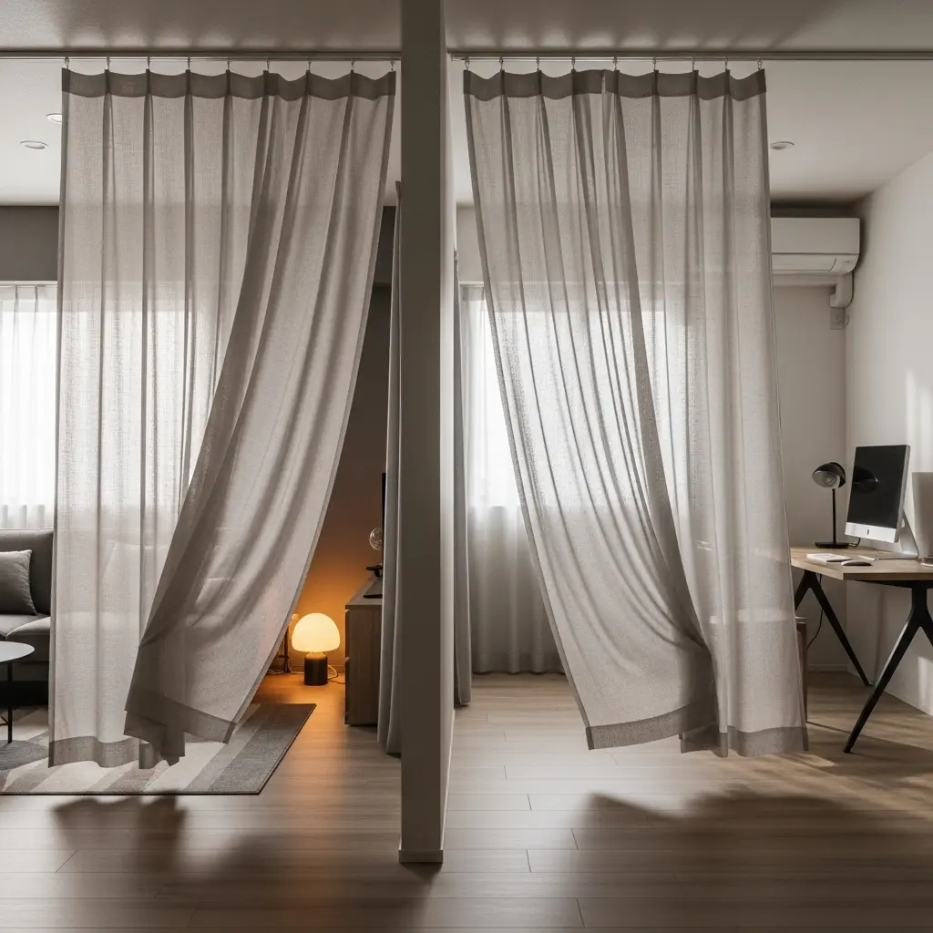 Las cortinas ligeras son una opción flexible para dividir espacios. Permiten abrir o cerrar los ambientes según la necesidad, manteniendo un estilo moderno y funcional.