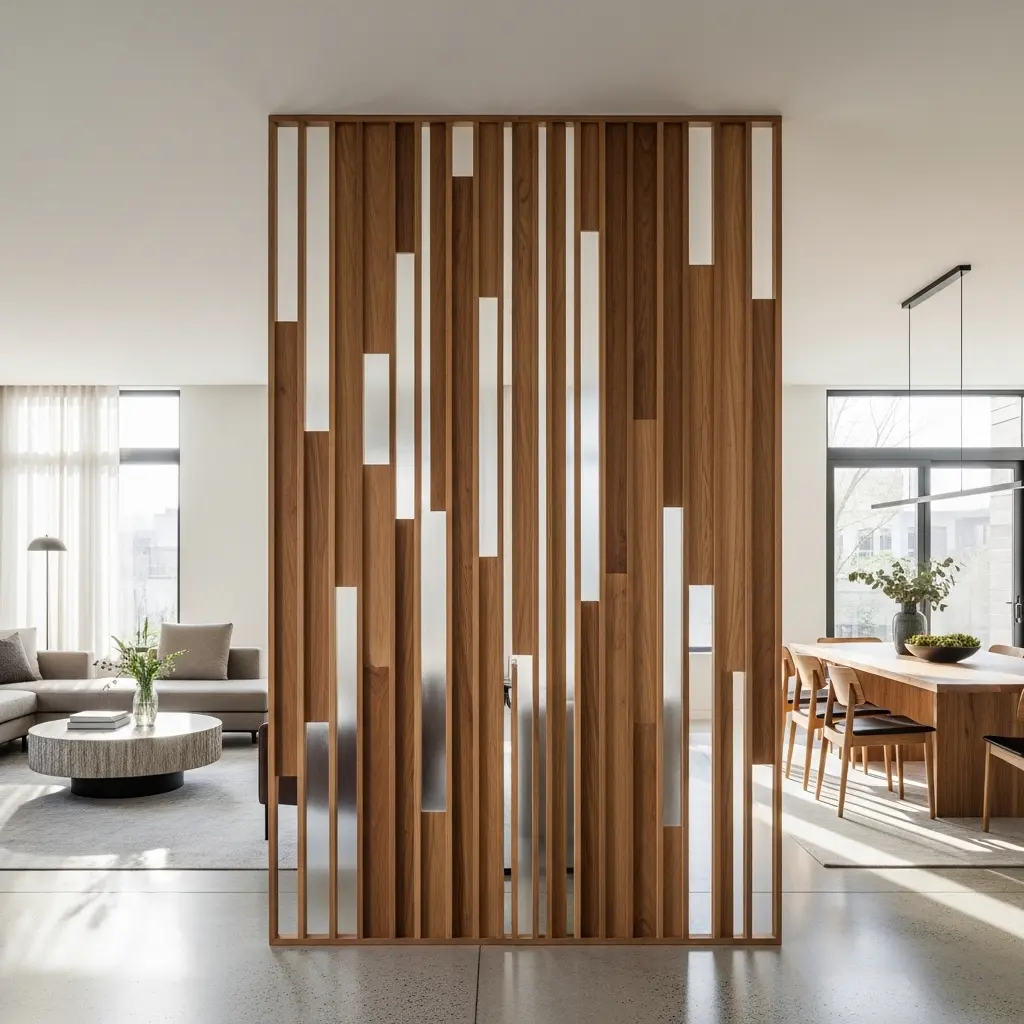 Los paneles decorativos son una opción elegante para dividir ambientes sin perder diseño. Pueden ser de madera, metal o materiales modernos, aportando un toque sofisticado mientras cumplen una función práctica.