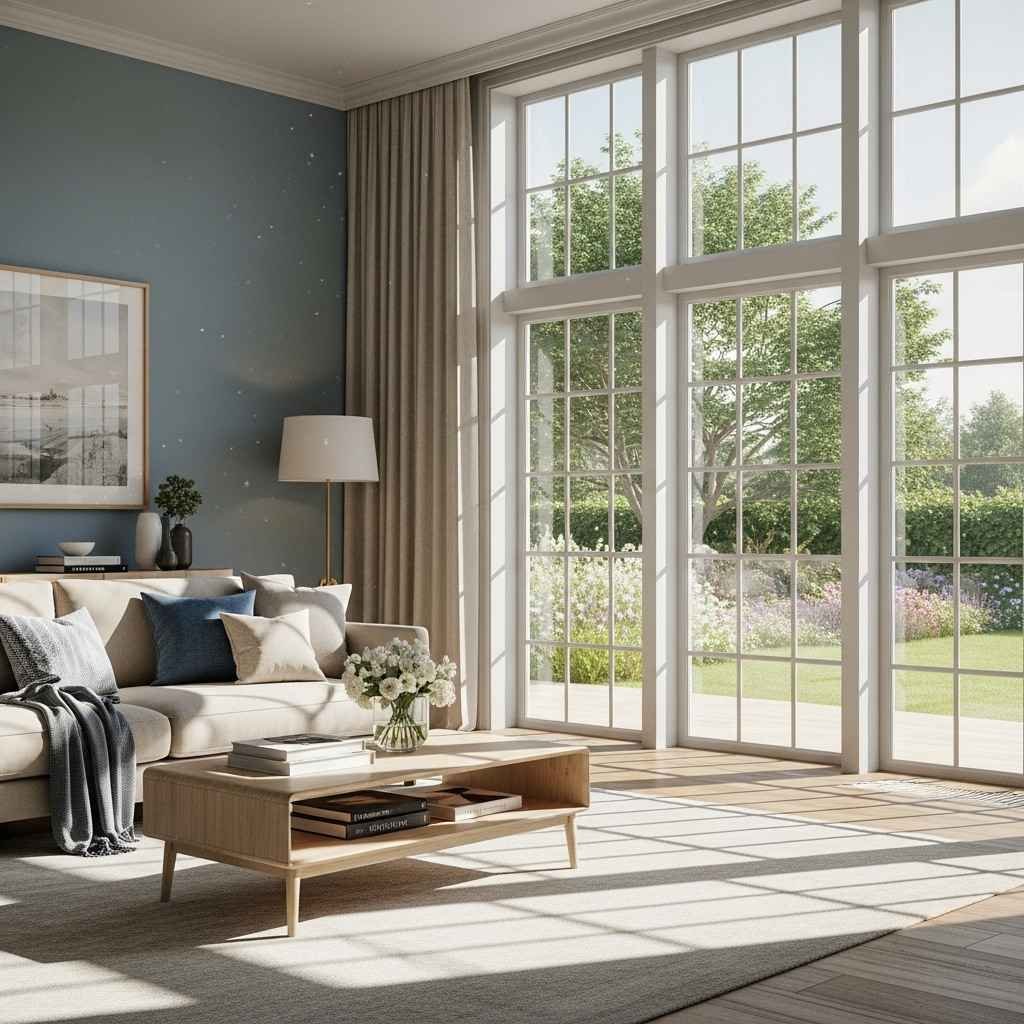 Los ventanales grandes potencian el efecto del color azul al aportar luz natural. Esto hace que la sala se vea más amplia y luminosa. Es una tendencia clave en diseños modernos.