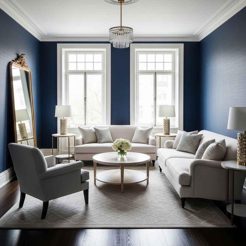 El azul navy es uno de los tonos más elegantes para una sala moderna. Aporta profundidad y sofisticación, especialmente cuando se combina con muebles en tonos blancos o beige. Este estilo crea un contraste visual muy atractivo sin perder armonía.