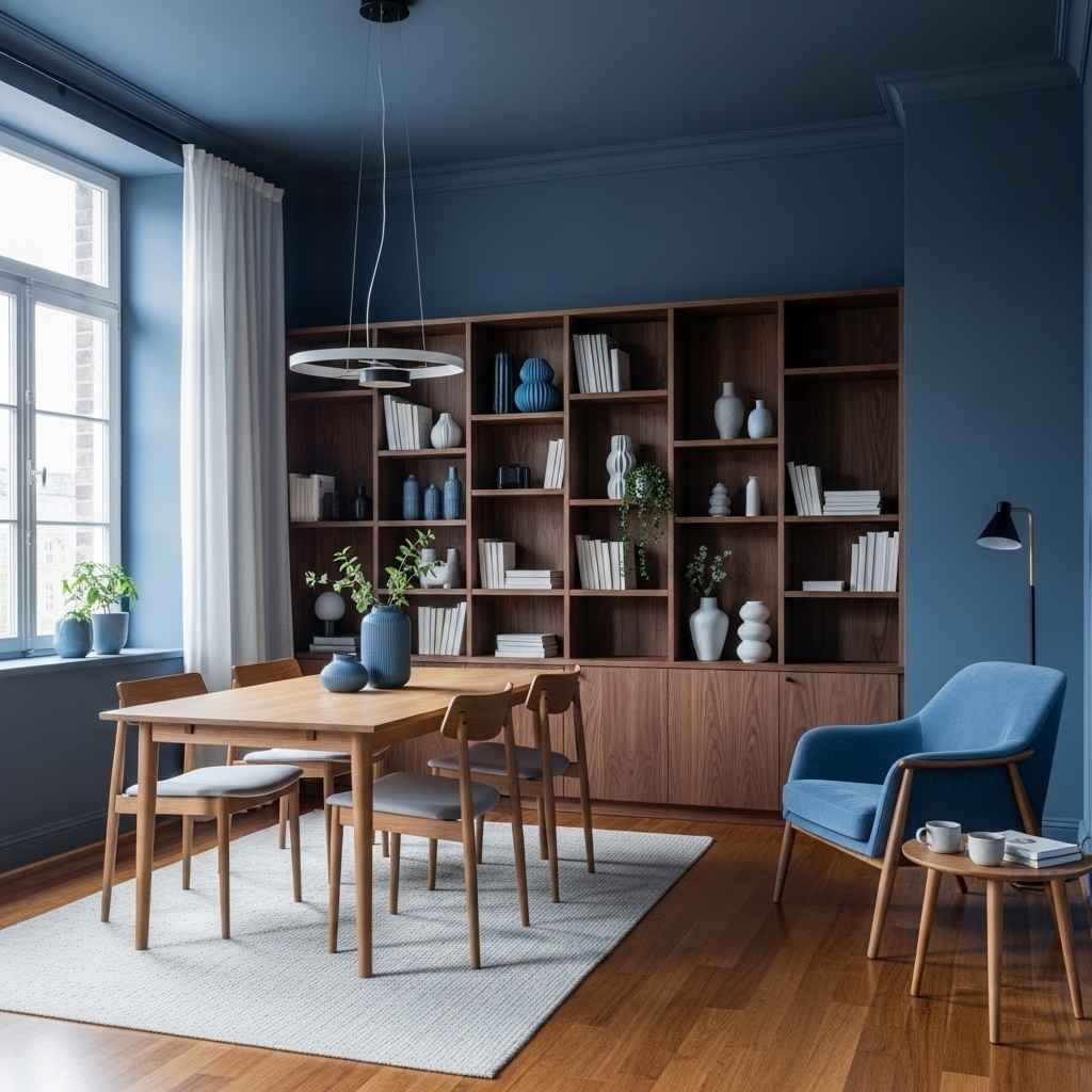 La combinación de azul con madera crea un equilibrio perfecto entre modernidad y calidez. Los materiales naturales suavizan la intensidad del color azul. Es ideal para un ambiente acogedor.