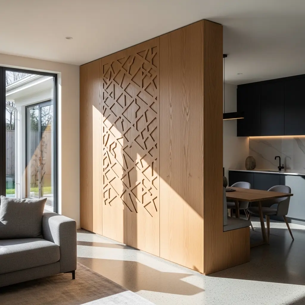 Los paneles decorativos son una opción elegante para dividir sin cerrar completamente el espacio. Aportan textura y estilo al ambiente. Además, mantienen la conexión visual.